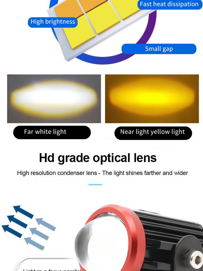 The Motorcycle LED Headlamp Kit features a combination of white and yellow light, providing a balanced and natural color temperature that is easy on the eyes and enhances visibility. The white light provides a clear and focused beam, while the yellow light helps to improve contrast and reduce eye strain, especially in foggy or low-light conditions.